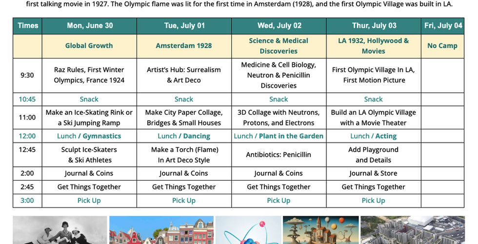 The early 20th century inspired Week 4 projects, highlighting the first Winter Olympics, the modern pentathlon, and advances in medicine and science. Campers explored talking films with The Jazz Singer and the first Olympic flame in Amsterdam, blending history, art, and innovation in a week filled with creative learning. 🔥🎬